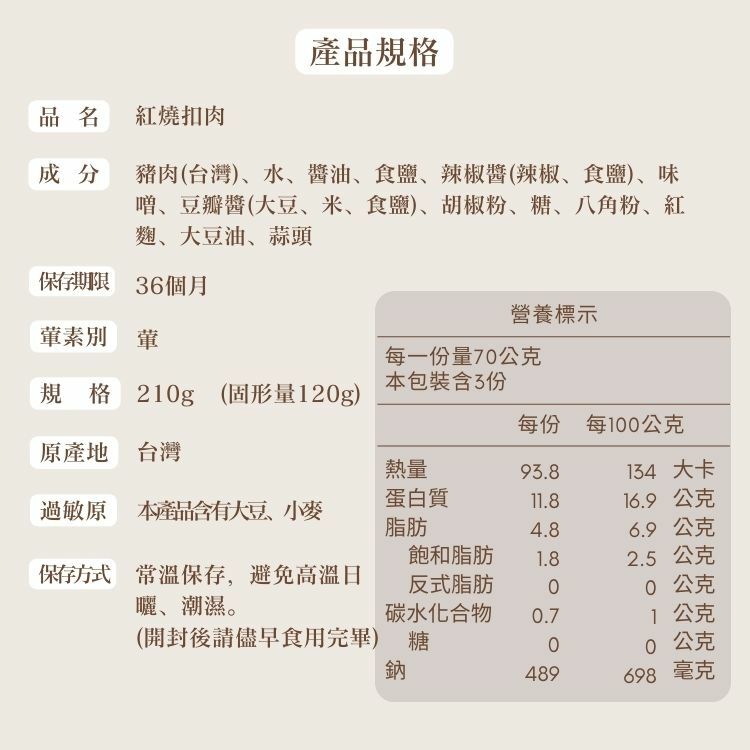 ●豬前腿肉經分切後,獨特紅燒醬汁烹煮後經過高溫殺菌,肉質軟嫩不柴