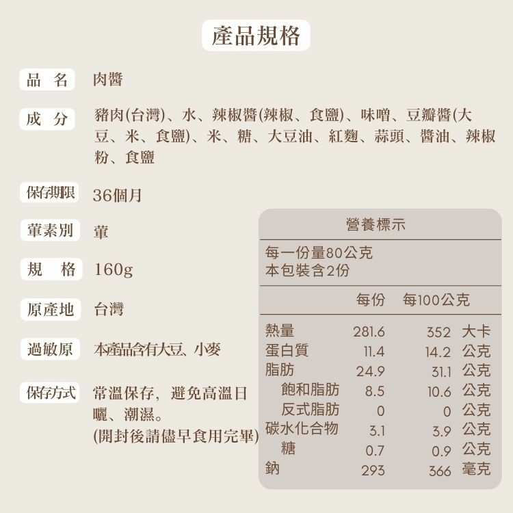 ●使用100%台灣豬前腿肉搭配紅麴與廣達香特調獨門配方烹調而成
