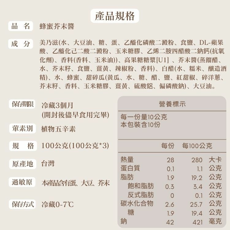 ●知名品牌法式芥末醬、甜碎瓜、蜂蜜…等調味而成