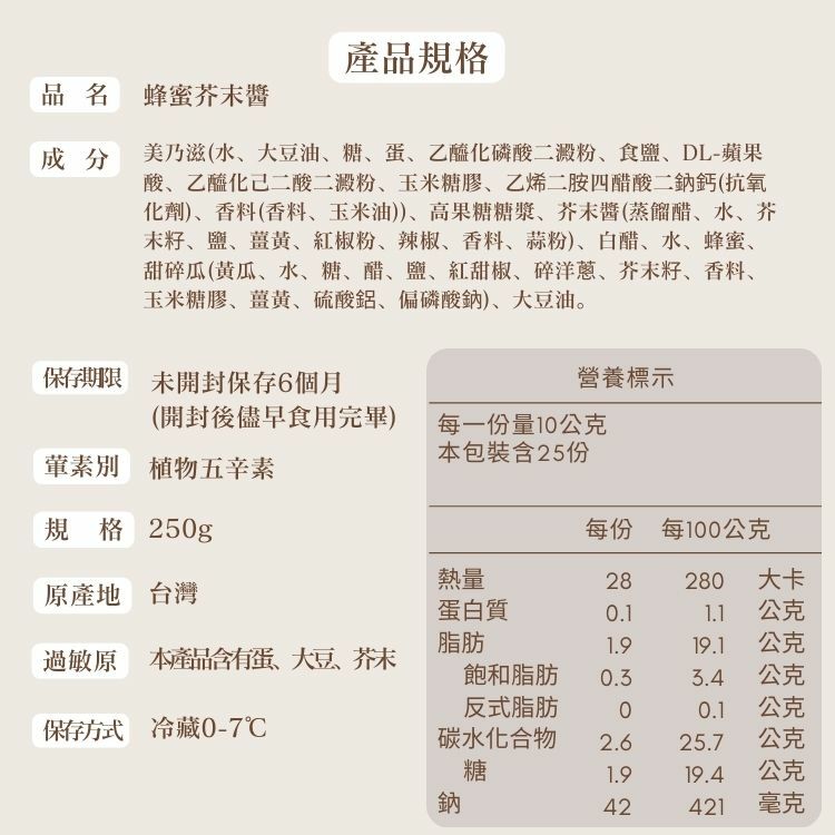 ●知名品牌法式芥末醬、甜碎瓜、蜂蜜…等調味而成