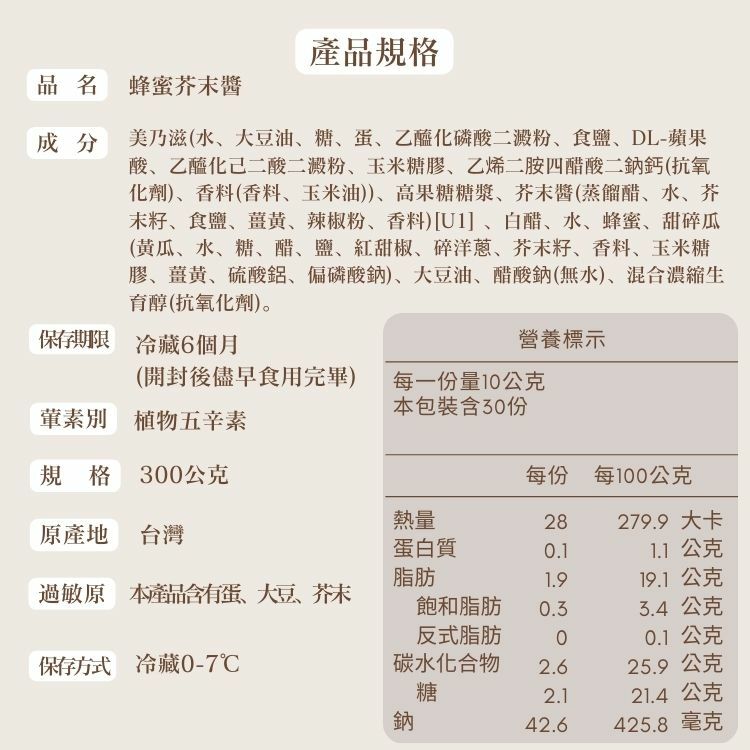 ●知名品牌法式芥末醬、甜碎瓜、蜂蜜…等調味而成